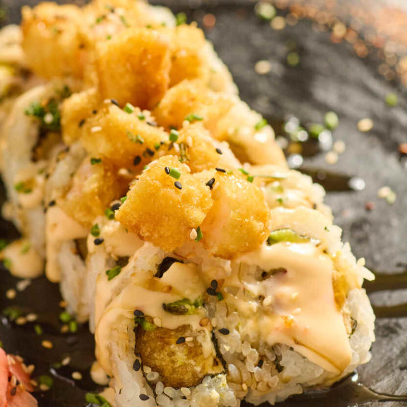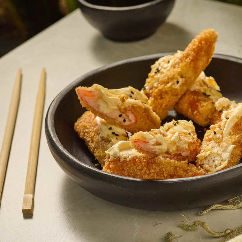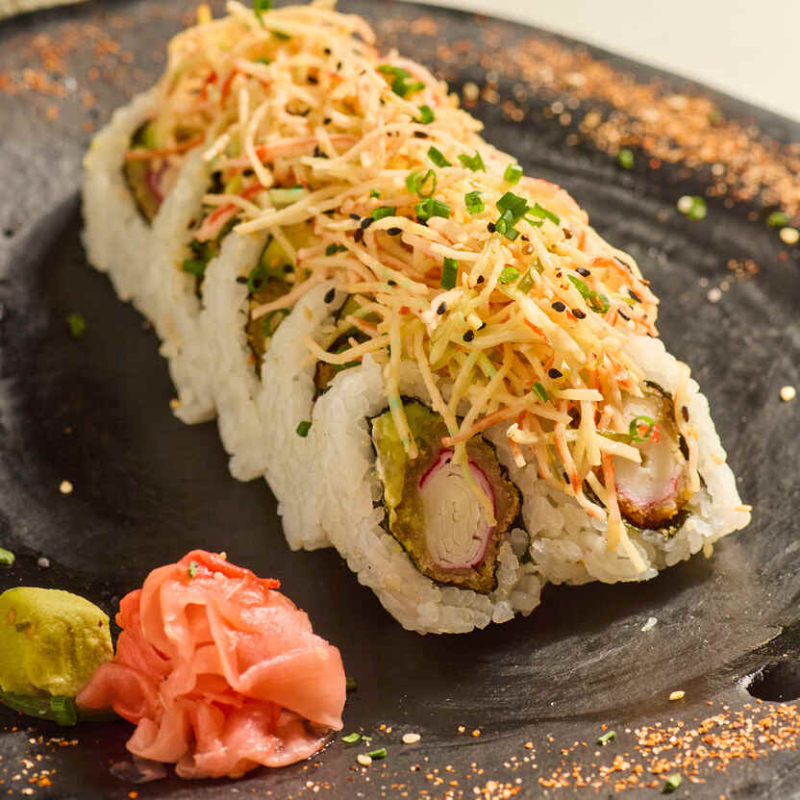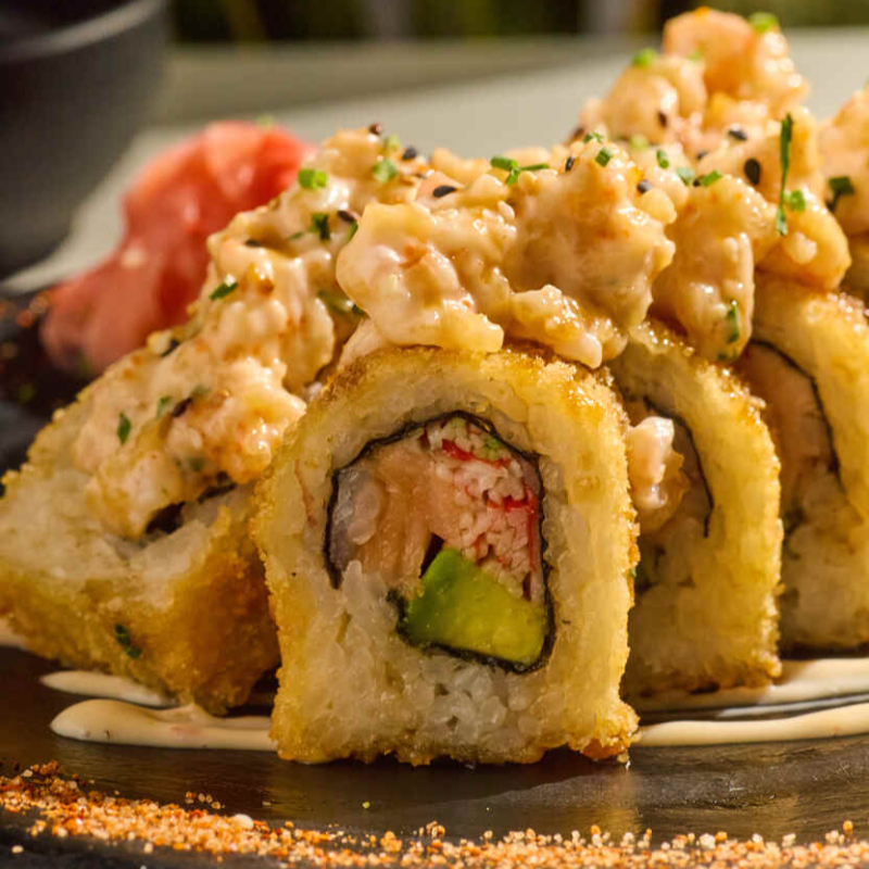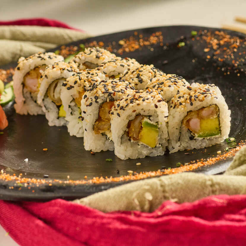 Sushi de kanikama, queso crema y aguacate, finalizando con ajonjolí y camarones apanados.