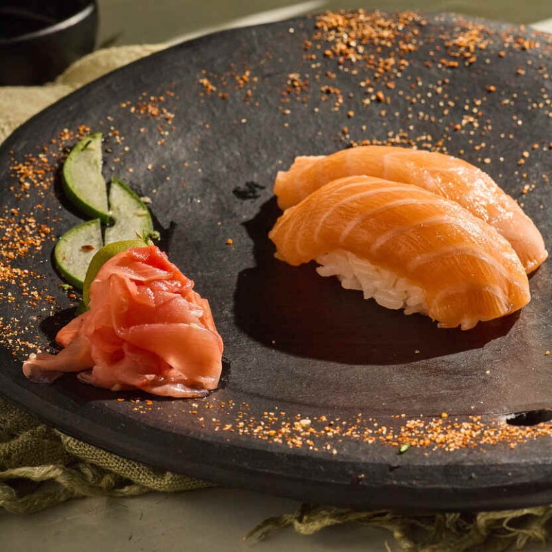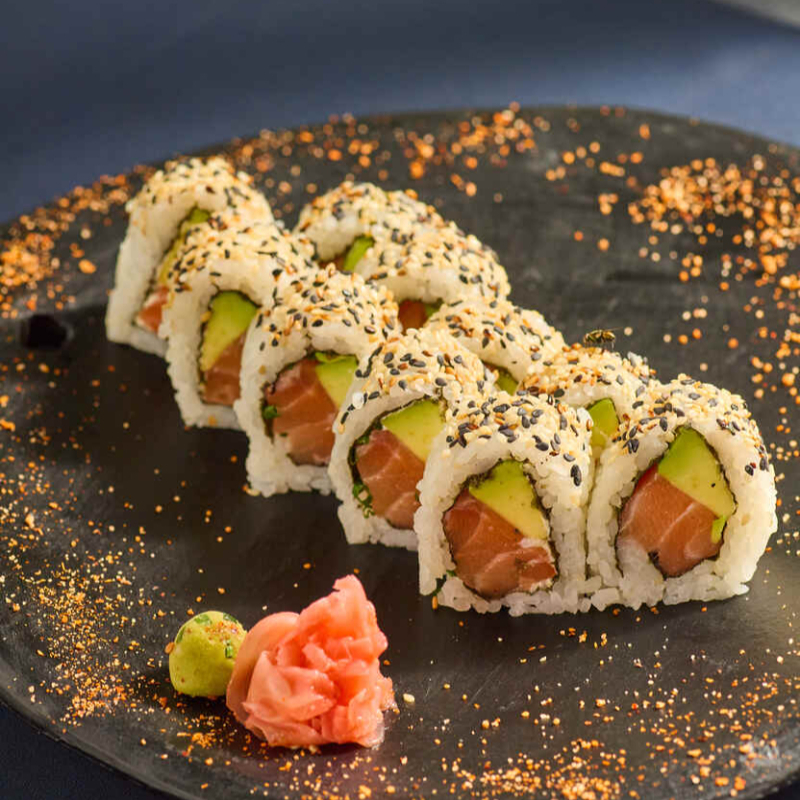 Roll clásico philadelphia al estilo hamachi, salmón fresco, queso crema y aguacate, finalizado con ajonjolí.