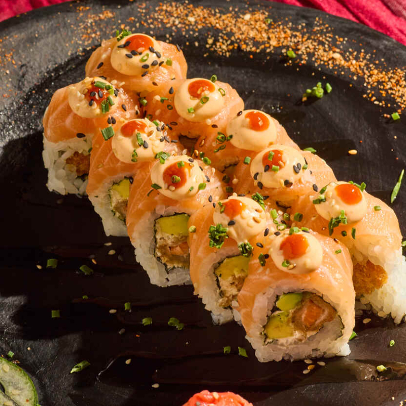 Crocante de salmón, aguacate, queso crema, cebollín y cubierto de salmón fresco.