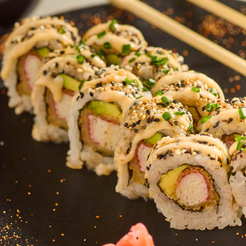 Roll a base de cangrejo, queso crema y aguacate, finalizando con salsa dinamita de la casa (kani, wakame).