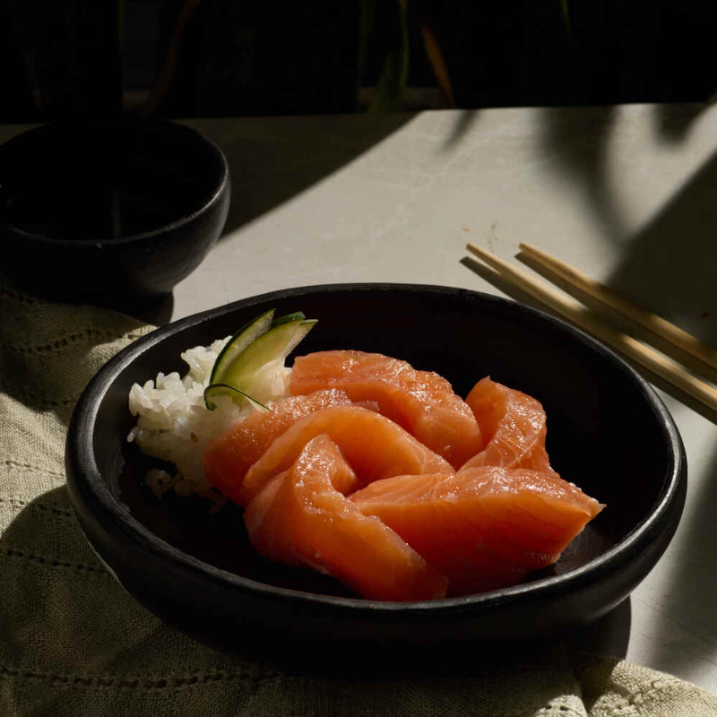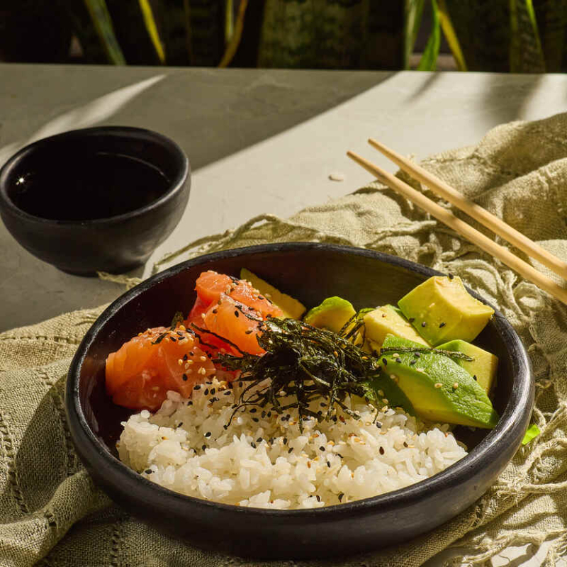 Delicioso Poke con base de arroz de sushi, aguacate, salmon fresco y alga nori