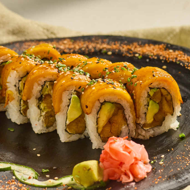 Delicioso Roll de platano maduro, aguacate y queso crema. Finalizado con topping de platano maduro y salsa teriyaki