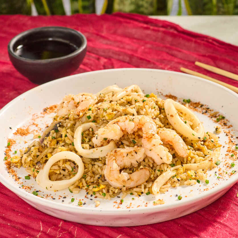 Delicioso Arroz salteado, con camarones, calamar y vegetales frescos