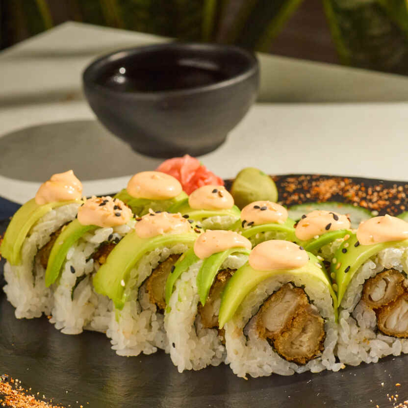 Langostino encostrado en panko, queso crema y aguacate (apanado), salsa dragón y teriyaki.