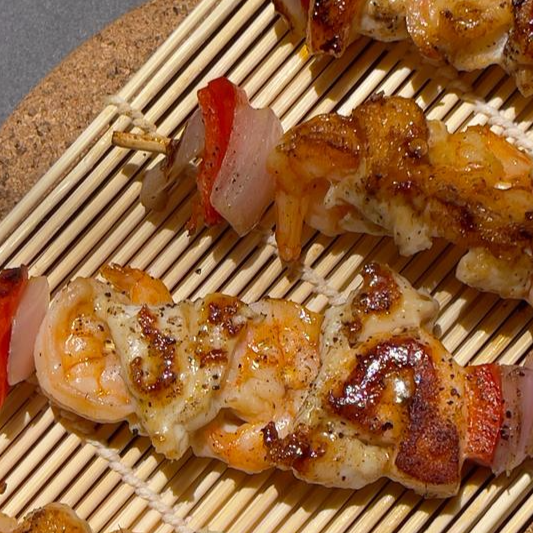 Deliciosas BrocheKanton con camarones, pollo, salmón, pimentón rojo y cebolla (4 UNIDADES)