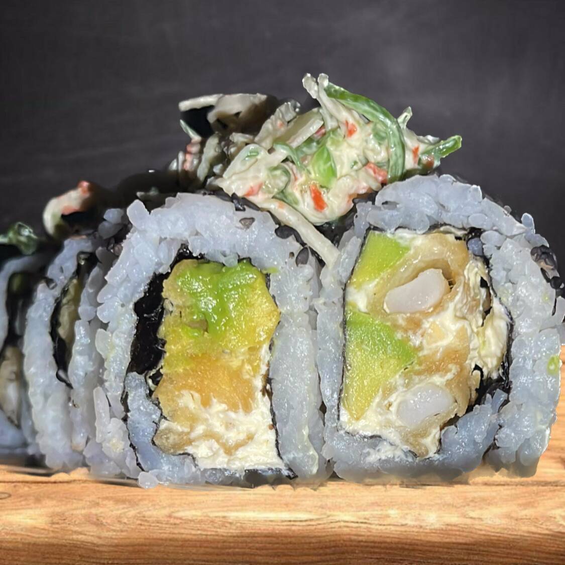 10 deliciosos bocados de sushi crudo, rellenos de pescado basa tempurizado, con aguacate, queso crema, con topping de camarones en salsa Fuji y cebollín.