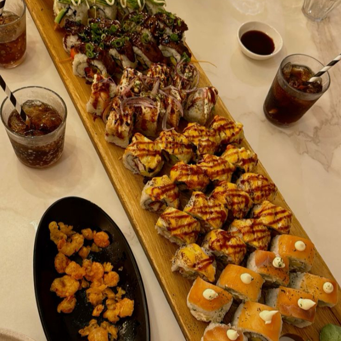 Deliosos 10 bocados de sushi rellenos de langostino tempurizado y queso crema, con topping de atún crudo, mango, salsa spicy truly y cebollín.