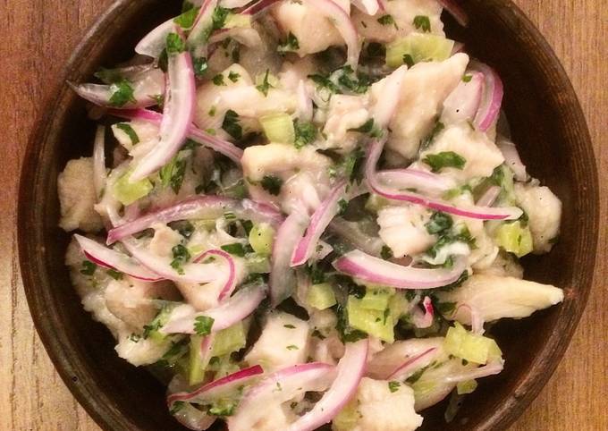Camarones, tilapia, palmitos de cangrejo, pepino, cebolla, cilantro, leche de tigre.