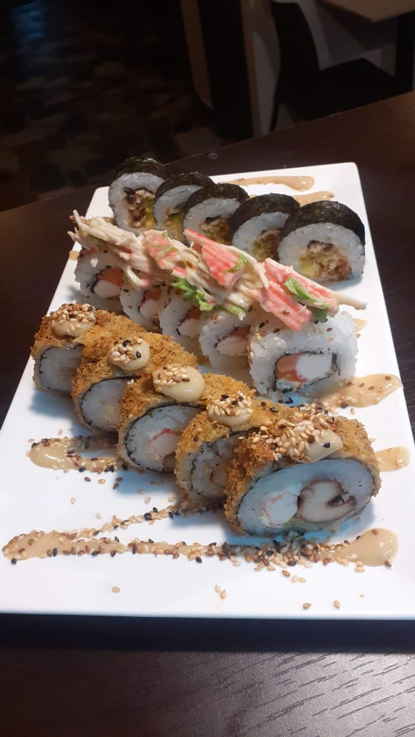 Buenos Aires (tilapia apanada, queso crema, plátano empurizado), california roll (palmito de cangrejo, queso crema, aguacate), más 2 bebidas a elección.