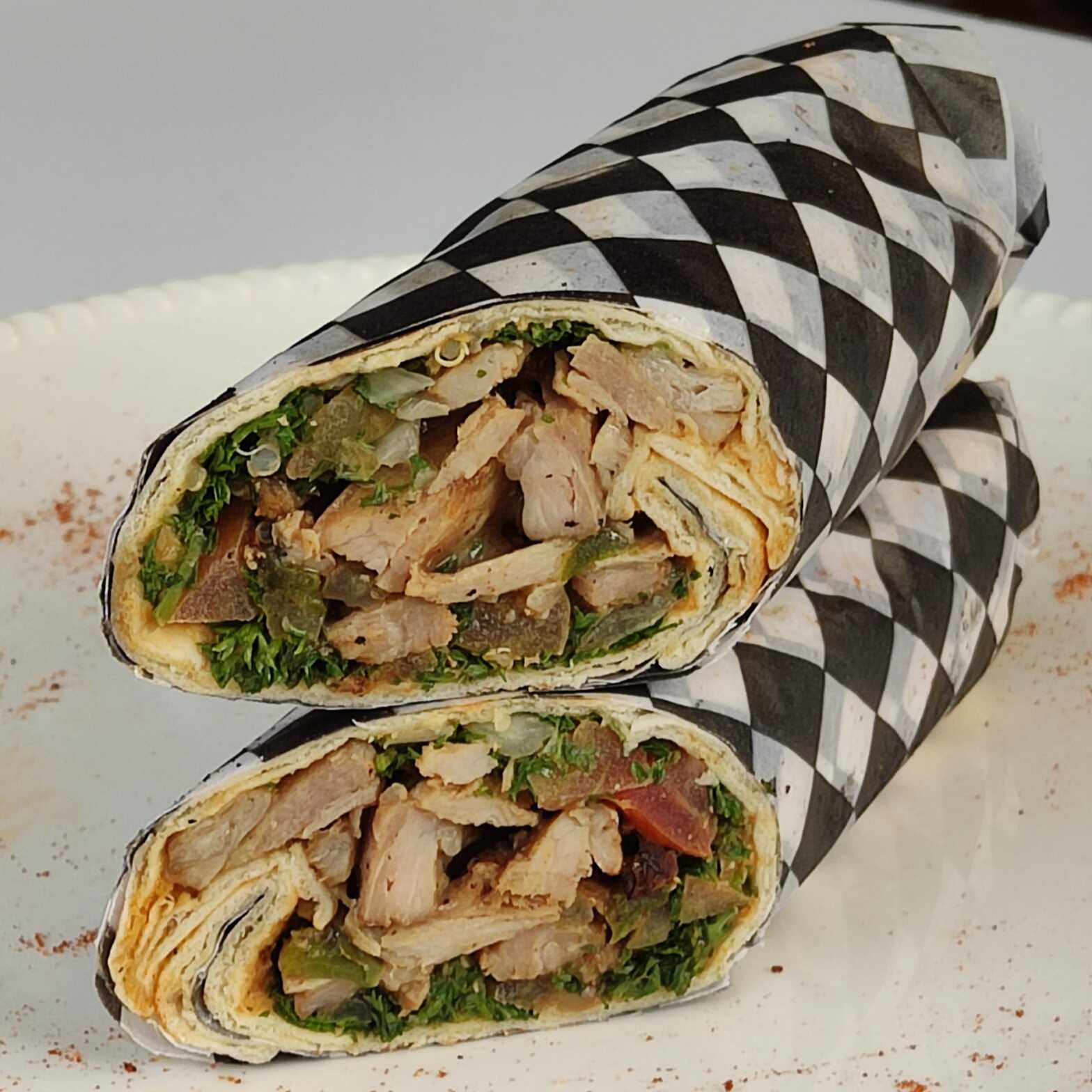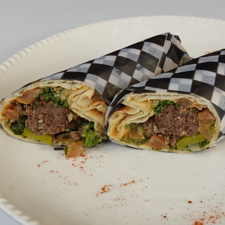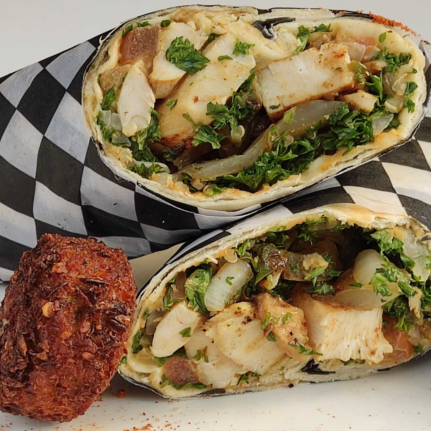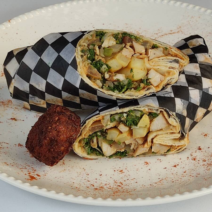 Pollo, falafel, tabbuleh y hummus envuelto en rollo de pan pita.