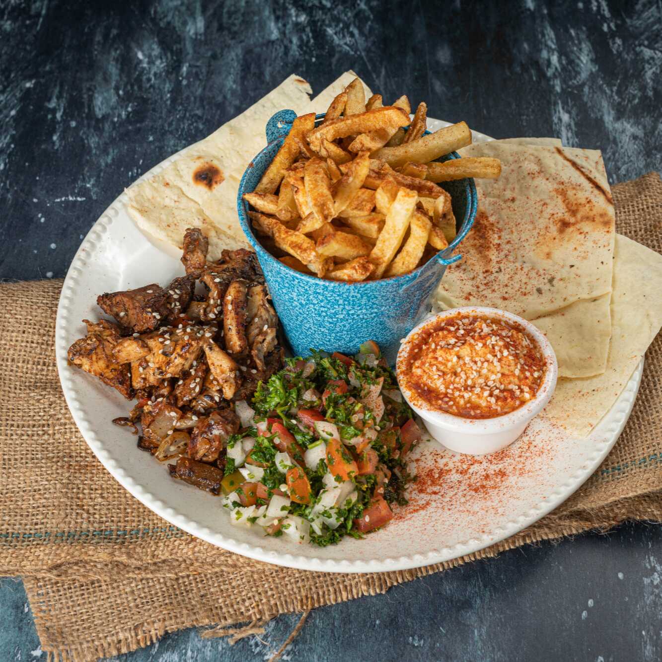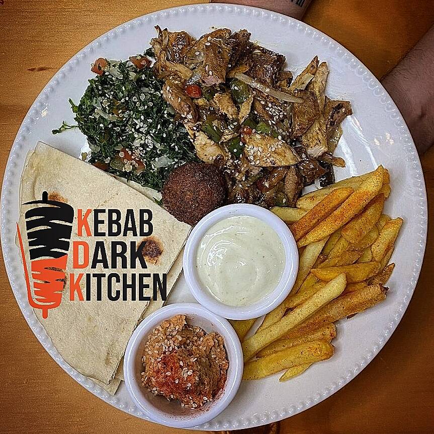 Arma pequeños Kebabs a tu gusto con pollo, tabbuleh, hummus, falafel y papas a la francesa.