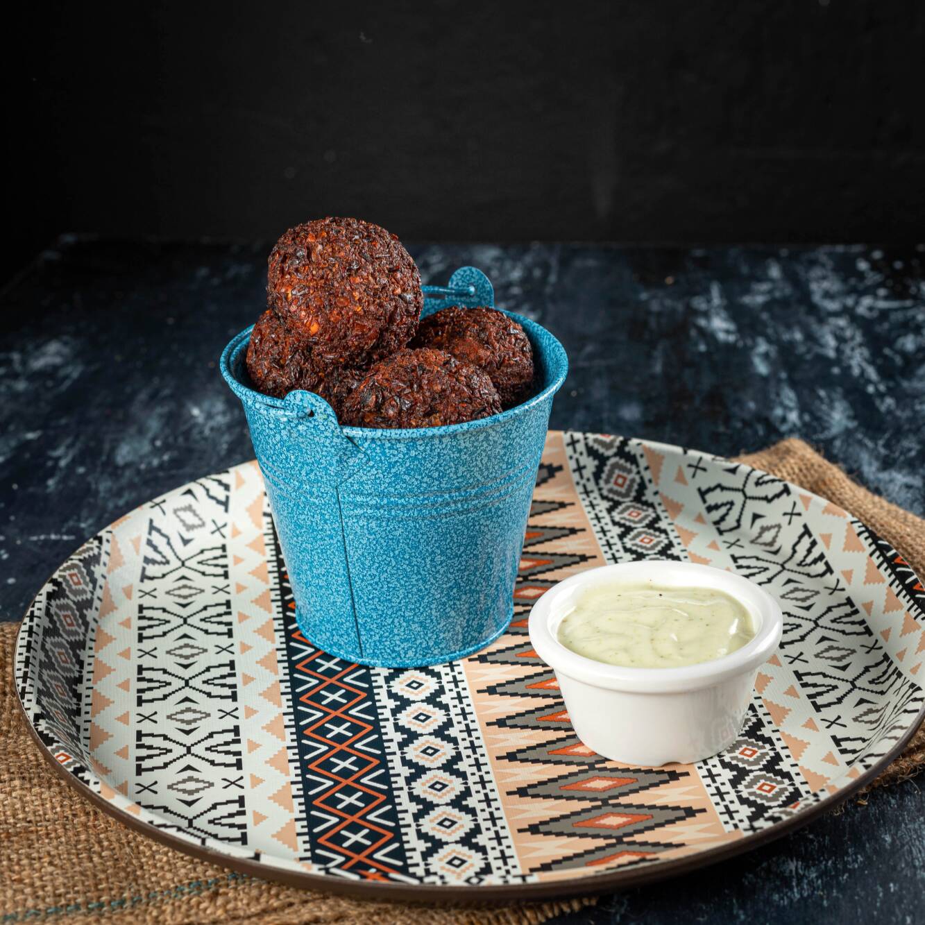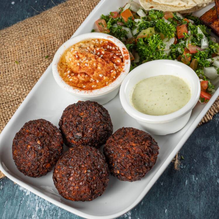 Fiesta vegana 6 falafel, pan artesanal, hummus, tabbuleh, papas a la francesa.