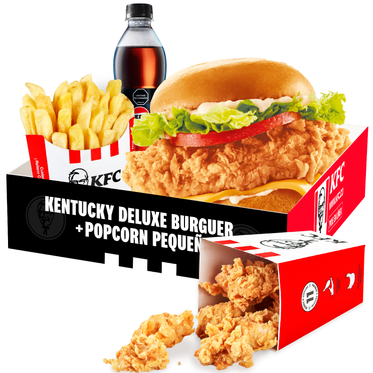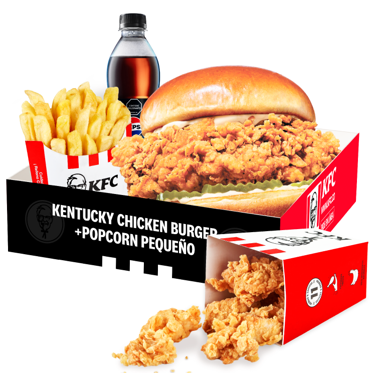 1 Kentucky Chicken Burguer (1 Filete de pechuga de pollo apanado, pepinillos, mayonesa premium y mantequilla) + 1 PopCorn Peq + 1 Papa Peq + 1 Gaseosa Pet 400ml + 1 Balde de Salsa Secreta 120g