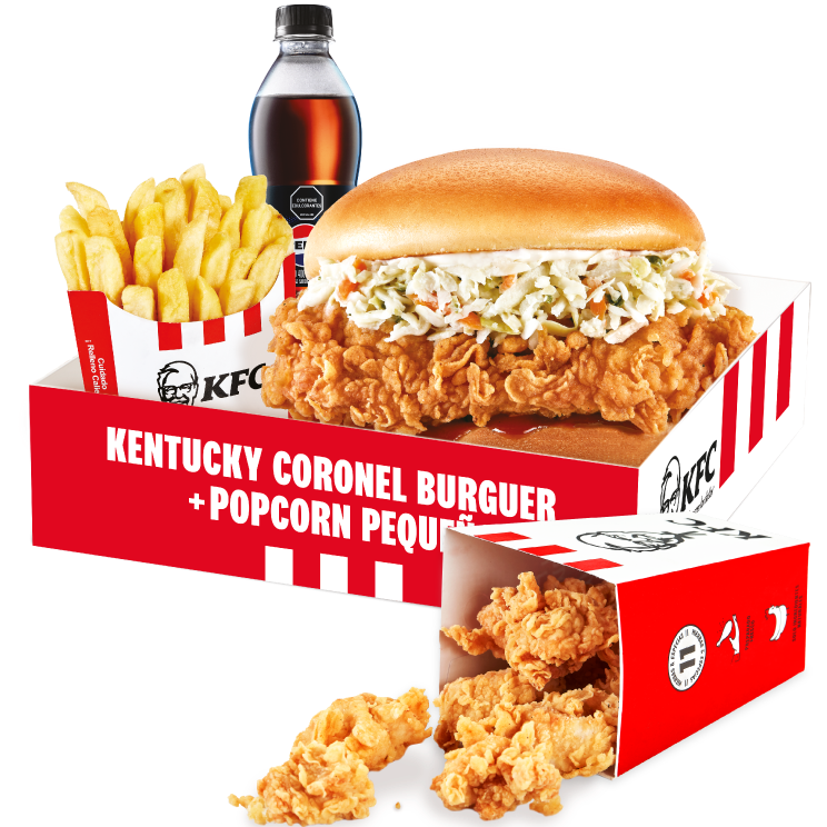 1 Kentucky Coronel Burger (1 Filete de pechuga apanado, Ensalada Coleslaw, BBQ y mantequilla) + 1 Pop Corn Pequeño+ 1 Papa Pequeña + 1 Gaseosa PET 400ml