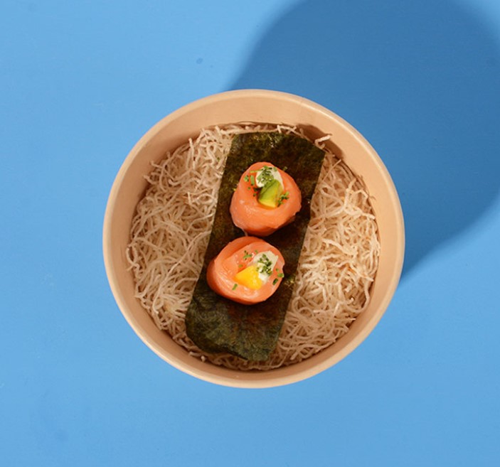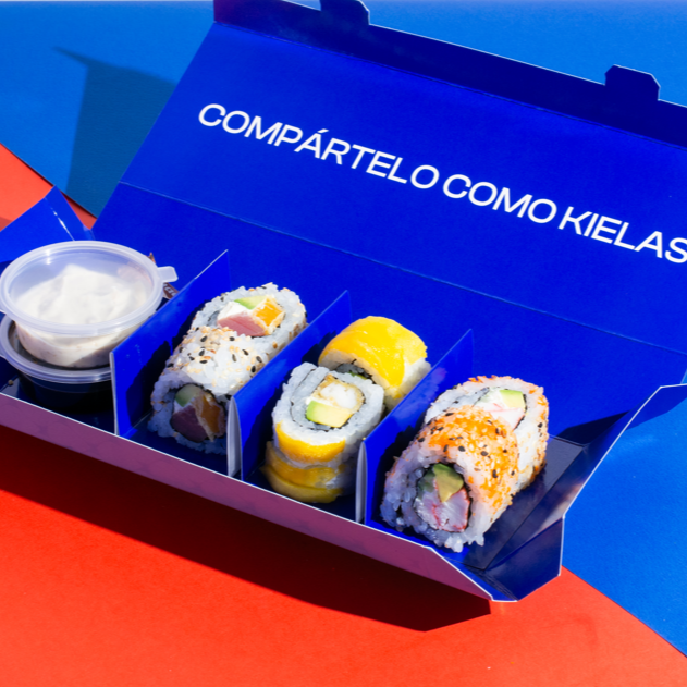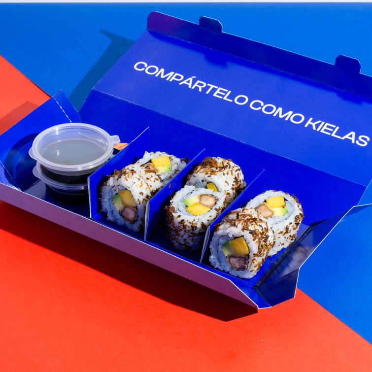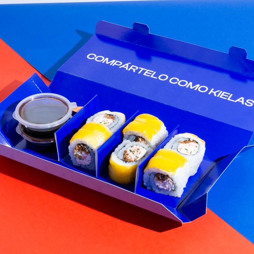 Rollo de rollo de 4 piezas New York: salmón, aguacate, queso tope ajonjolí. 4 Piezas takara: mango, queso, aguacate tope salmón ahumado. 4 Piezas kielo: mix de kanis con cebollín y chicharrón de salmón tope de durazno.