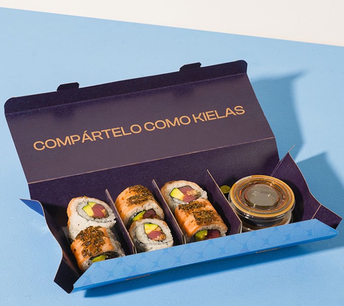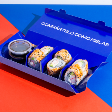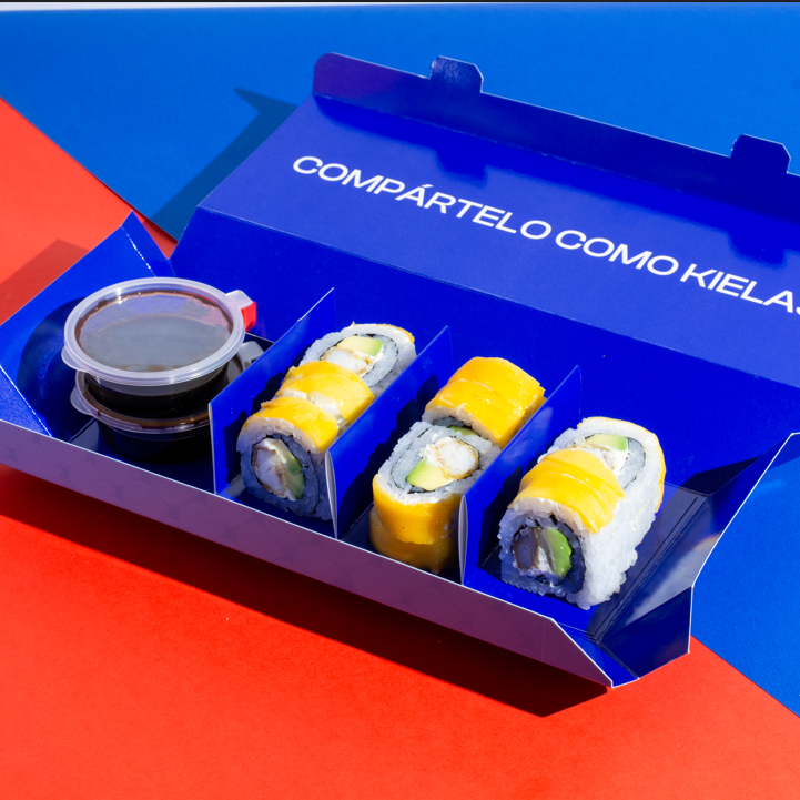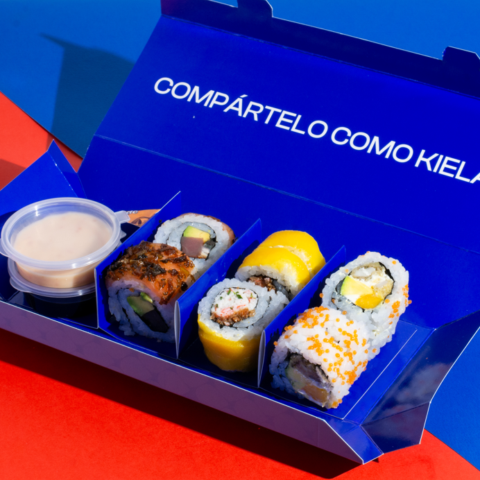 Rollo de 4 piezas trilogía: atún, salmón, anguila y queso crema puerro caramelizado. 4 Piezas kielo: mix de kanis con cebollín y chicharrón de salmón tope de durazno. 4 Piezas Queso, Aro de calamar apanado, mango, aguacate y tope de tosago.