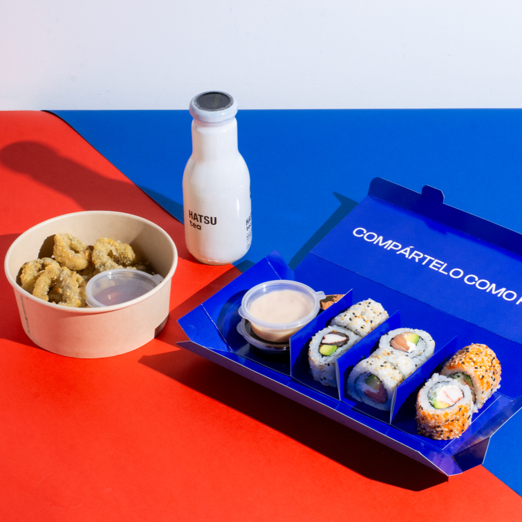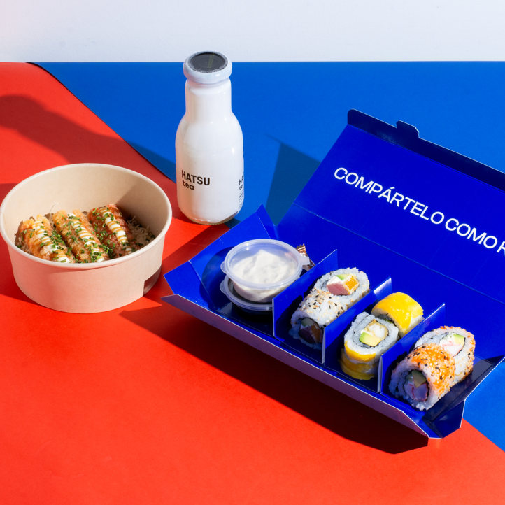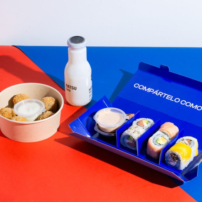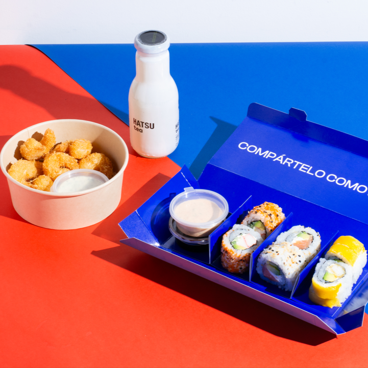 Rollo de 4 piezas california: kani, queso, pepino, aguacate tope ajonjolí y masago. 4 Piezas new york: salmón, aguacate, queso tope ajonjolí. 4 Piezas fuku: tilapia al curry apanada, queso, aguacate tope mango. Entrada de crispetas de camarones con salsa tártara. Hatsu 250 ml a elegir.