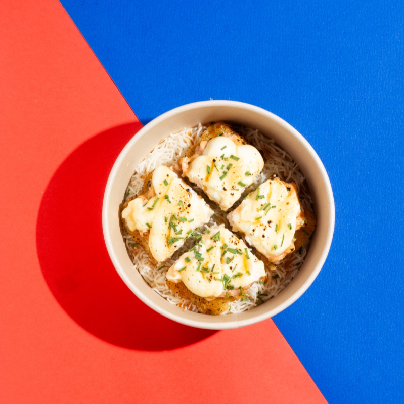 Base de arroz frito Cubierto con atun o salmón spicy con queso crema gratinado y salsa sweet chilli
