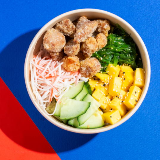 Arroz de sushi, salmón y atún fresco, cubos de aguacate, zanahoria y repollo morado, wakame (ensalada de algas), mezcla crispy noodle y puerro caramelizado más salsa mango spicy.