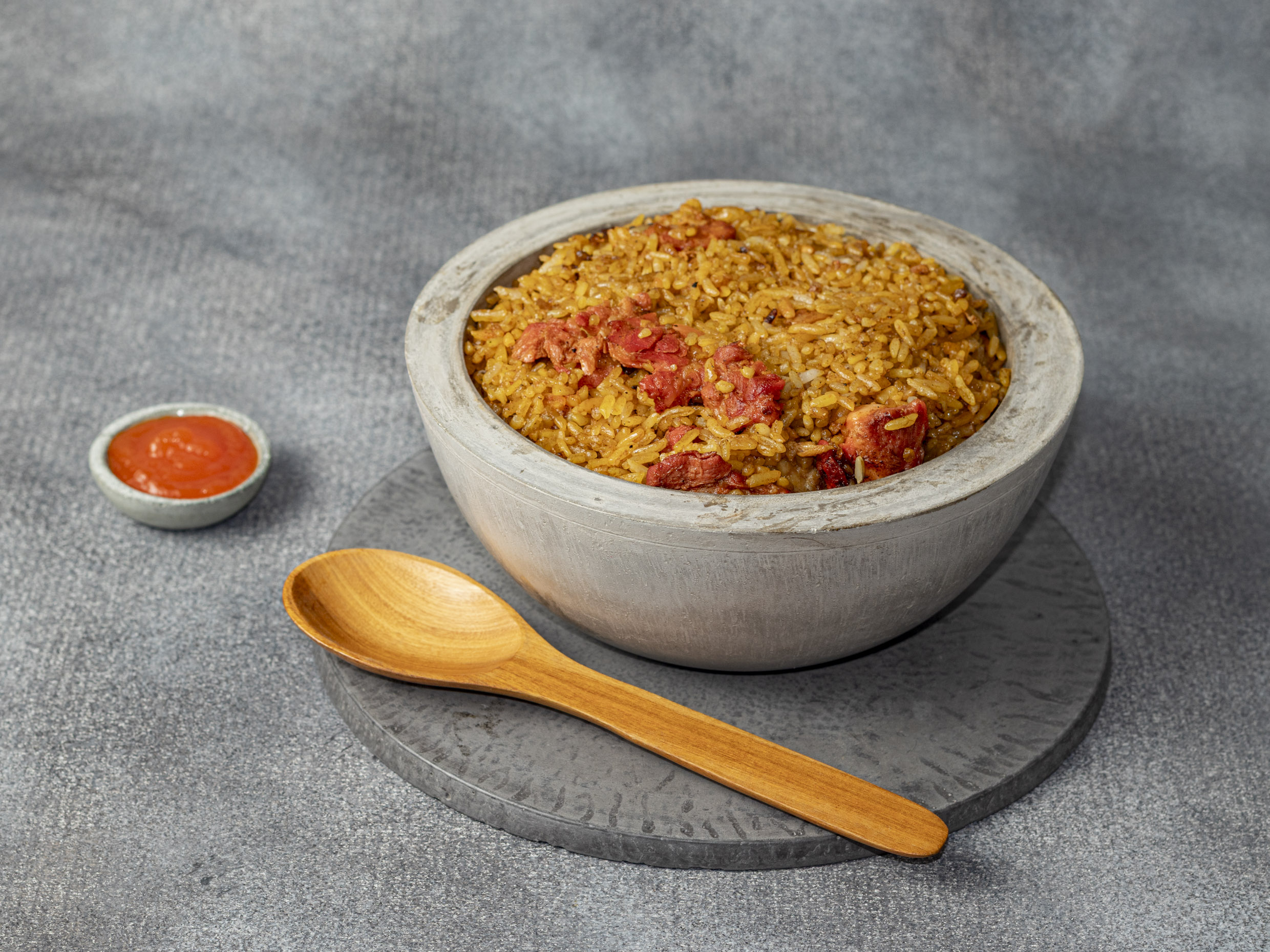 Arroz con pollo, cerdo, maduros y maicitos (Porcion 1 persona)
