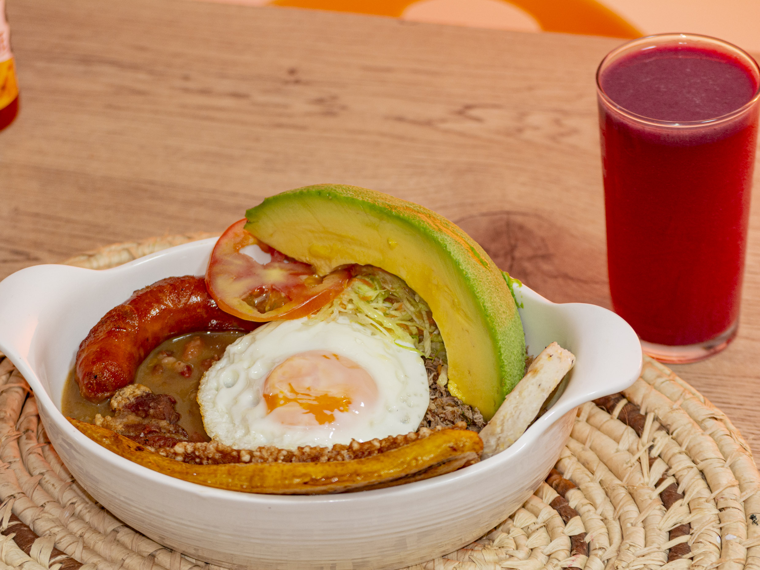 Frijoles, chicharrón, chorizo, carne, huevo, arroz, ensalada, arepa, aguacate, tajada de maduro y bebida.