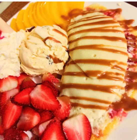 Helado de tres leches 70 gr, tortilla 30 gr, salsa frutos rojos 60 gr, queso 30 gr, mozzarella 50 gr, fresas 100 gr, duraznos 100 gr, cerezas 12 gr, barquillo y chantilly 60 gr.