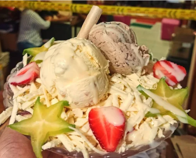 Helado a elección 140 gr, banano 50 gr, mango 50 gr, papaya 50 gr, melón 25 gr, fresas 50 gr, manzana 30 gr, crema de leche 50 gr, queso 100 gr, lechera 20 gr y un barquillo.