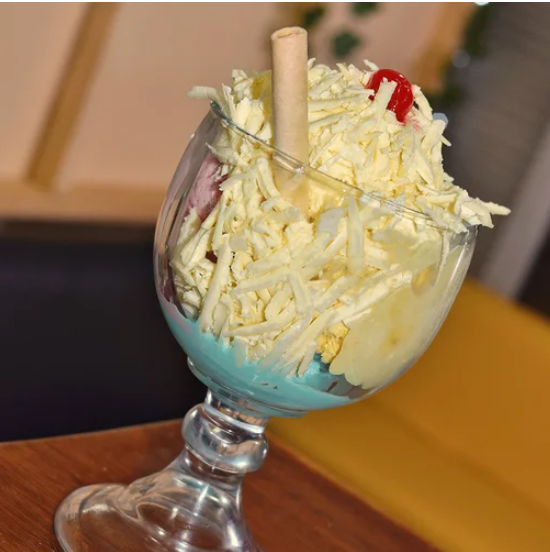 Helado de chocolate, vainilla y fresa 210 gr, banano 200 gr, chantilly 100 gr, salsa a elección 70 gr y 2 barquillos.