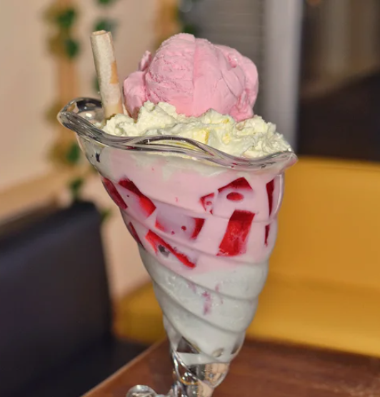 Helado de vainilla 140 gr, gelatina 200 gr, yogurt 50 gr, chantilly 60 gr, salsa a elección y barquillo.