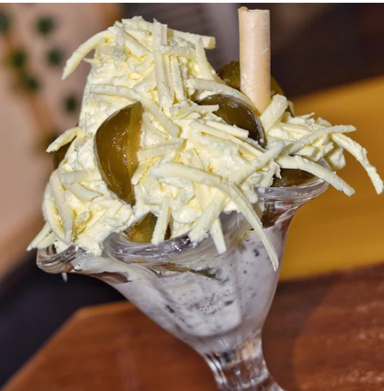Helado de chocolate, chicle y mandarina 210 gr, queso 100 gr, chantilly 60 gr, salsa de lecherita 30 gr, un barquillo y cerezas 12 gr.