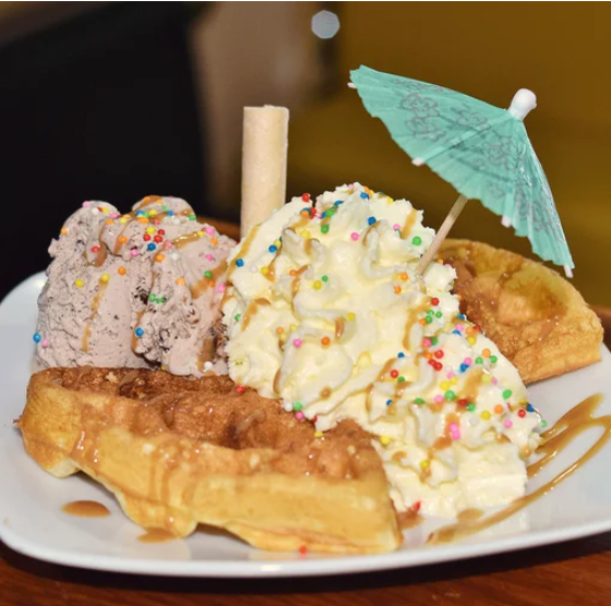 Helado de vainilla y arequipe 140 gr, waffle, chantilly 100 gr, queso 150 gr, salsa arequipe 70 gr y barquillo.