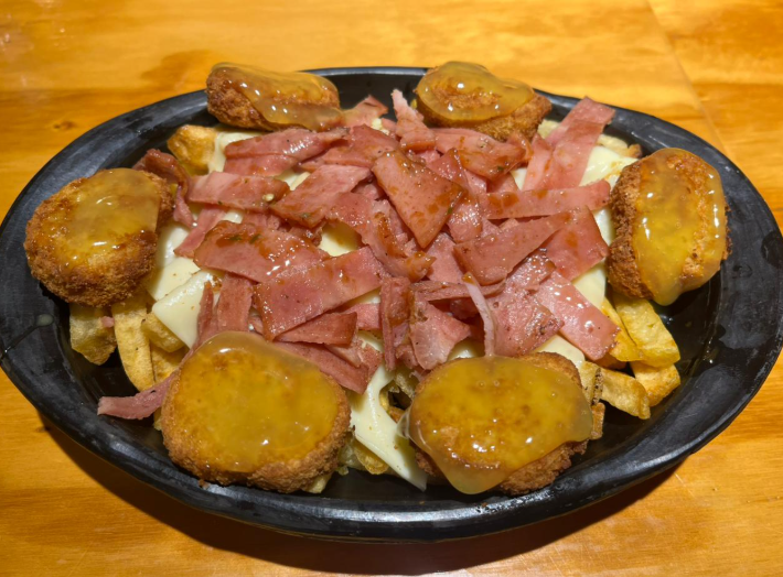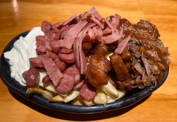 Chicharrón caramelizado, carne desmechada, salchicha, tocineta, sour créam, salsa de la casa.