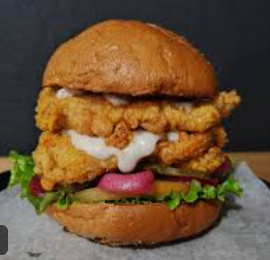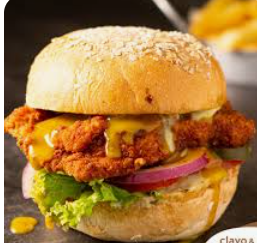Pollo apanado, carne, queso, tocineta, cebolla caramelizada, lechuga, mantequilla aderezada, salsas de la casa.