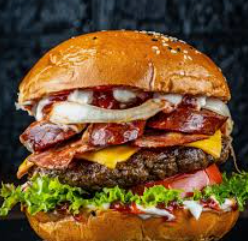 200 g De carne, chicharrón caramelizado, aros de cebolla, queso, tocineta, lechuga, cebolla caramelizada.