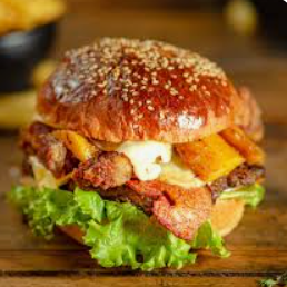 Carne o pollo, queso, tocineta, cebolla caramelizada, lechuga, mantequilla aderezada, salsas de la casa.
