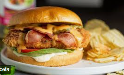 200 g De pollo apanado, queso, tocineta, lechuga, tomate, mantequilla aderezada, salsas de la casa.