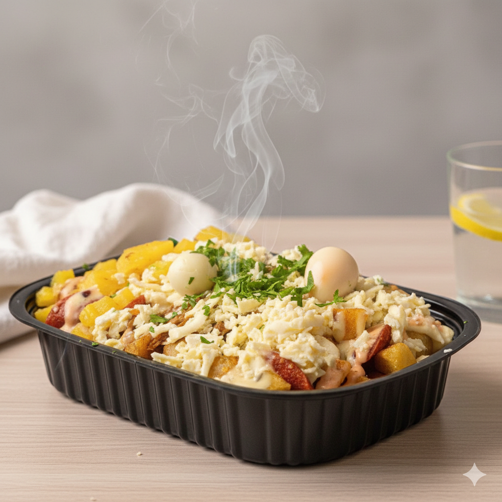 Chicharrón caramelizado, salchicha, huevos, sour créam, queso derretido, salsa de la casa.