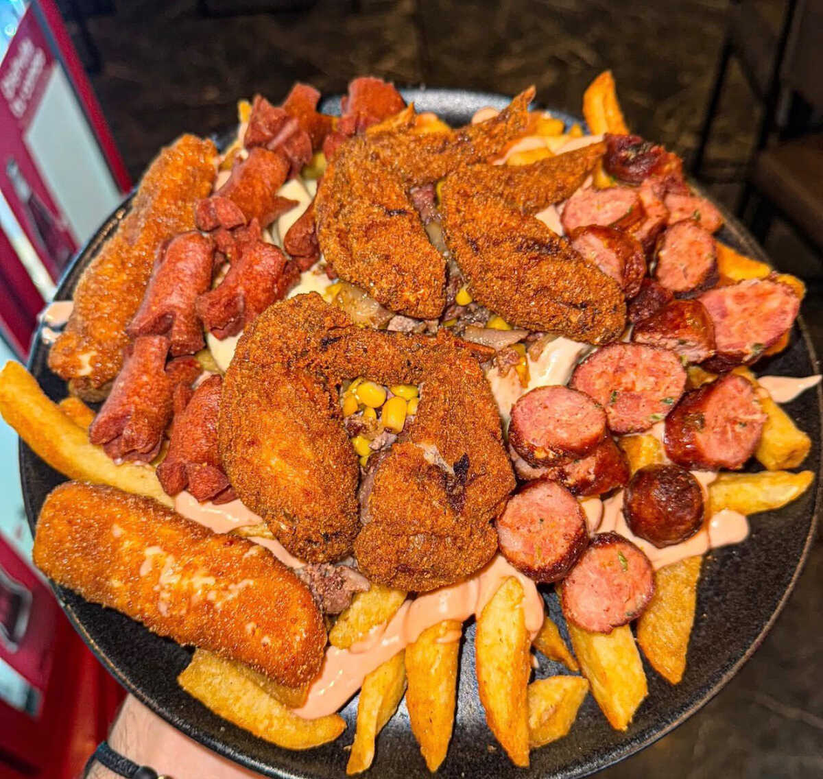 Chicharrón caramelizado, carne desmechada, salchicha, tocineta, sour créam, salsa de la casa.