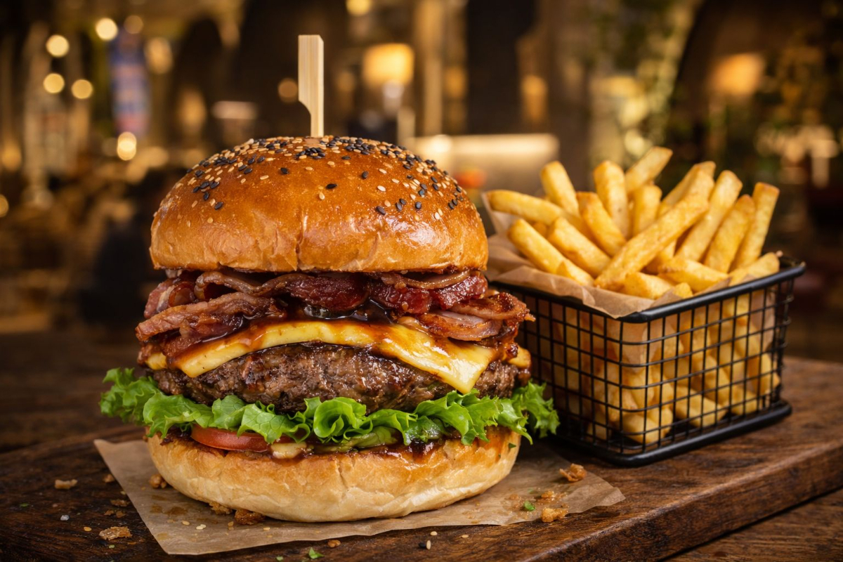 200 g De carne, chicharrón caramelizado, aros de cebolla, queso, tocineta, lechuga, cebolla caramelizada.