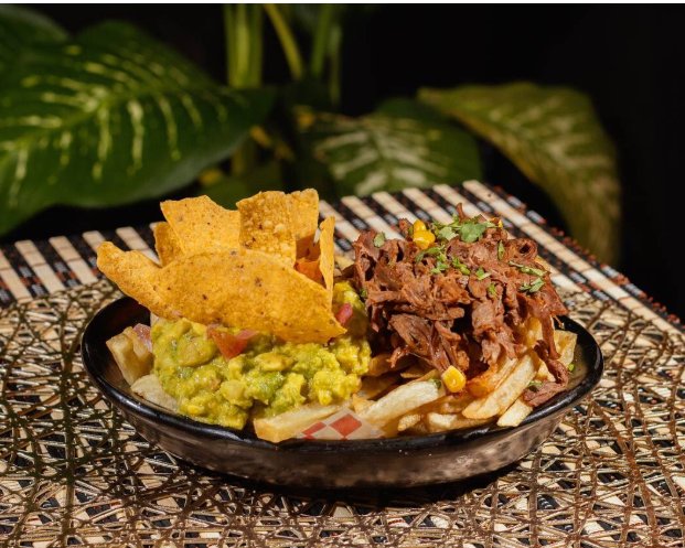 Carne desmechada, guacamole, sour créam, maíz dulce, salsa de la casa.