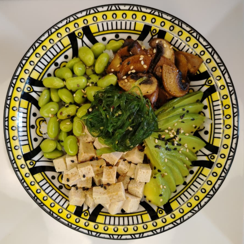 Arroz misurado, aguacate, champiñones salteados, edamame, tofu y wakame.
