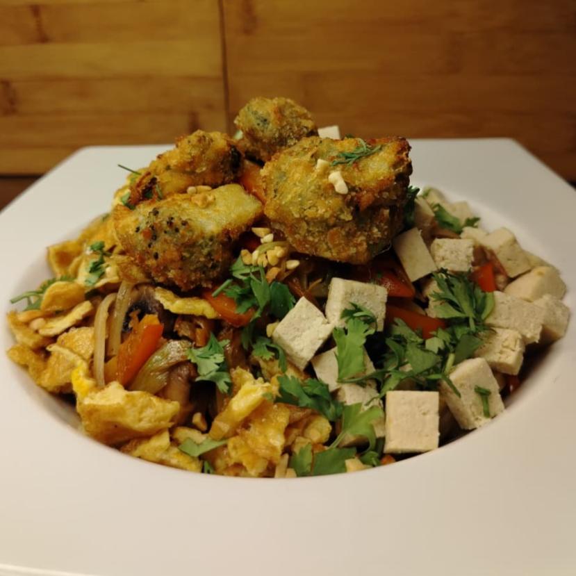 Tallarín de arroz acompañado con tofu, champiñones, huevo y verduras salteadas. Coronado con brócoli crocante.