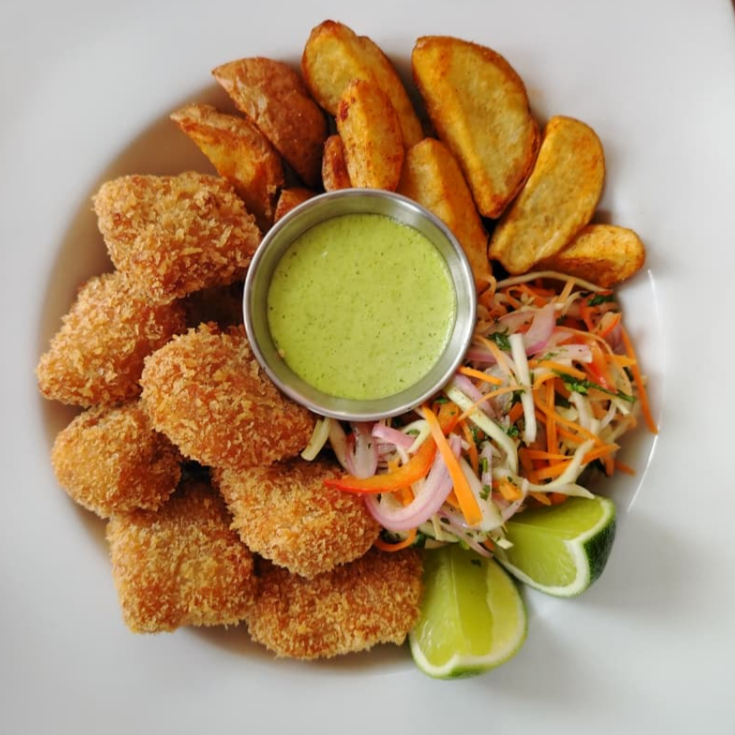 Croquetas de pescado, acompañadas de papas casco y ensalada fresca.