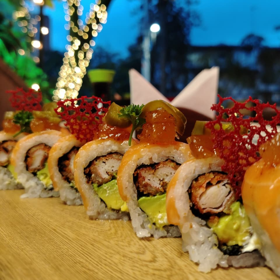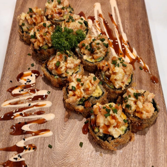 Salmón, camarón, aguacate y crema de pimiento dulce. Cubierto con kanikama crocante en salsa fuji y teriyaki.