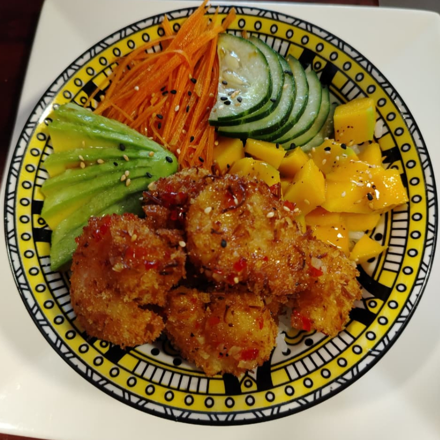 Arroz misurado, camarón apanado en coco, cebolla morada, zanahoria, aguacate, mango y pepino.