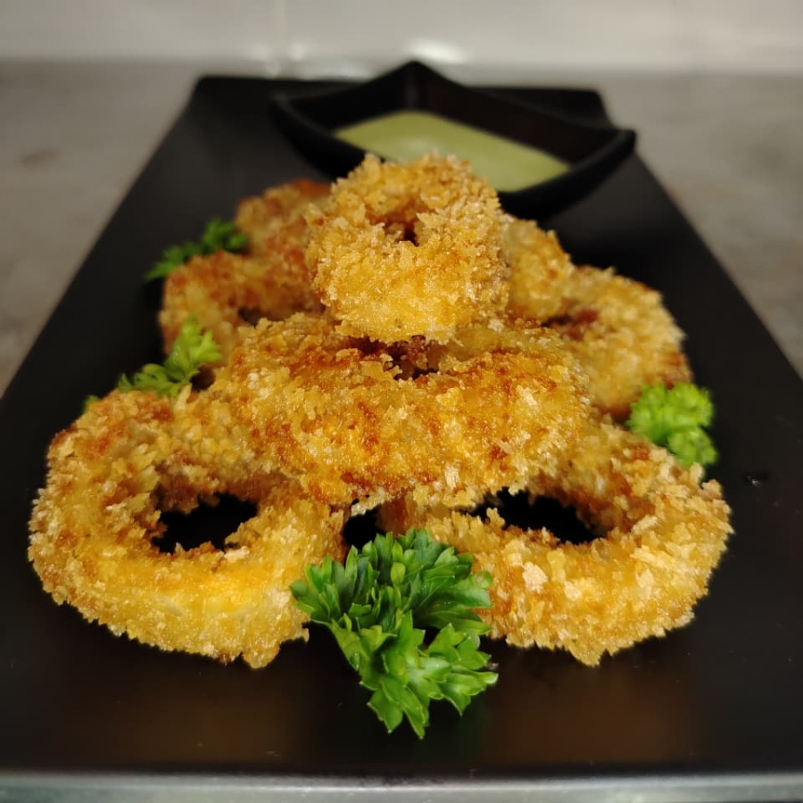 Anillos de calamar apanados, acompañados de salsa Fuji.