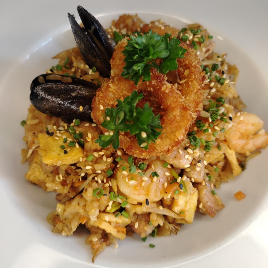 Arroz salteado al wok con camarón, calamar, cerdo, huevo y verduras con un toque de soya y aceite de ajonjolí. Coronado con calamar apanado.