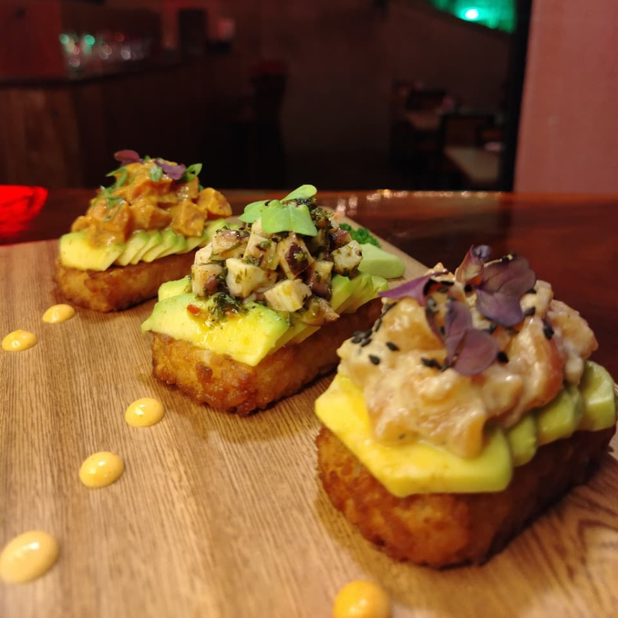 3 Tostadas de arroz frito: Atún spicy, tartar de salmón y pulpo acevichado.
