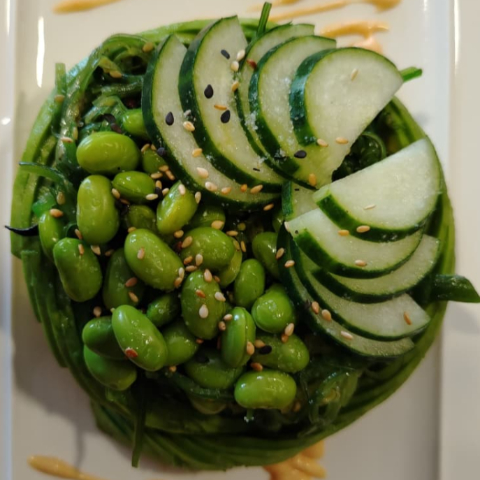Ensalada de wakame, aguacate, pepino y semillas de edamame con un toque de ajonjolí y mayo spicy.