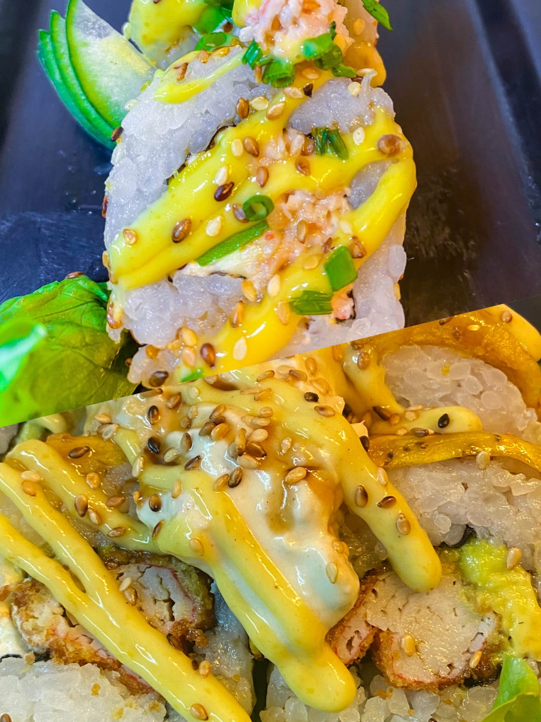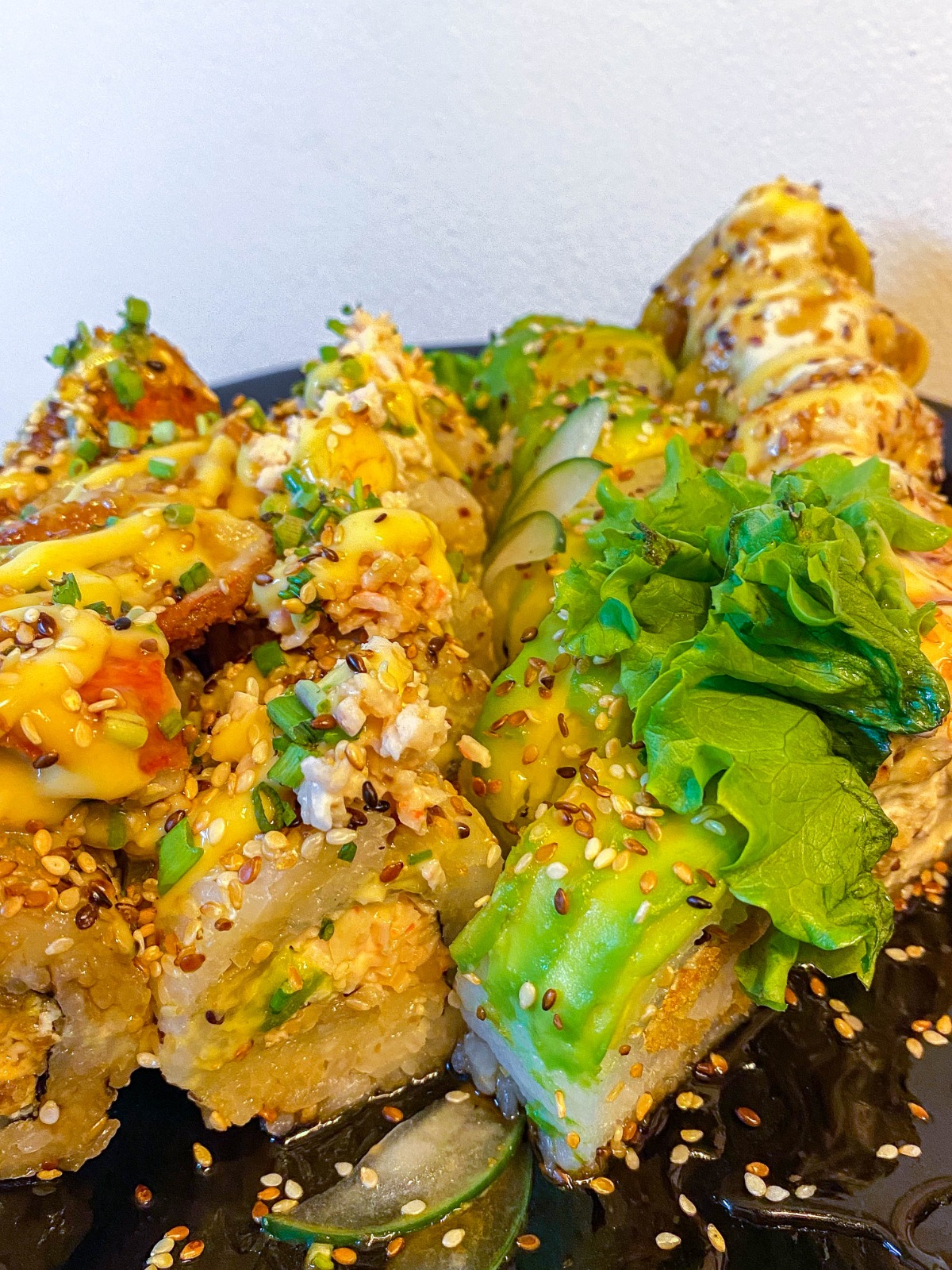 10 Bocados rellenos de queso crema, aguacate, pasta de cangrejo y topping de ajonjolí tostado.